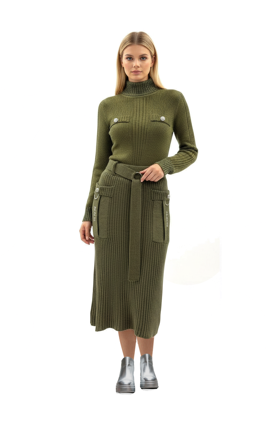 Sports-modischer Grün-Rippstrick-Rock mit Gürtel